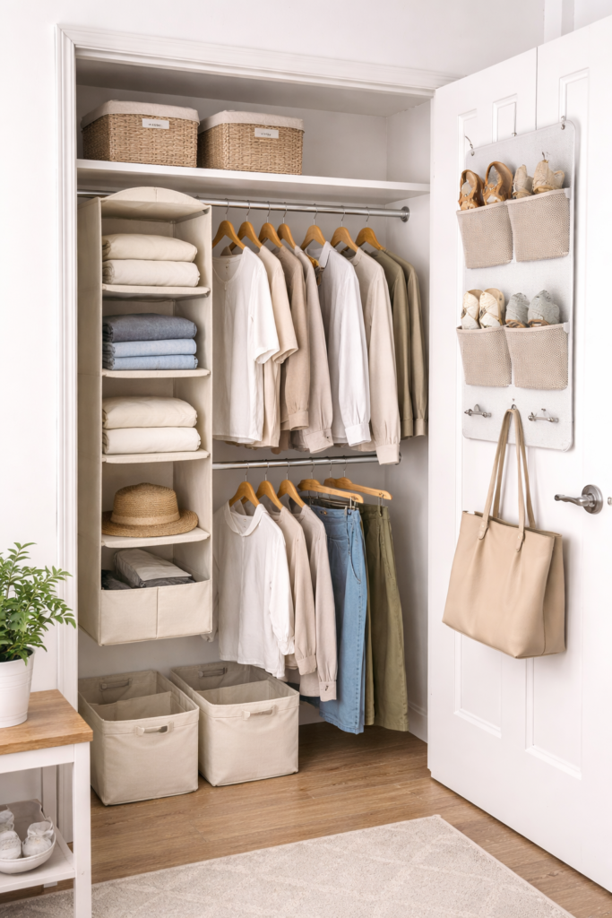 An over-the-door organizer adds vertical storage without drilling holes or installing shelves. Use it for shoes, accessories, folded clothes, or even small bags. Clear pocket versions make it easy to see everything at a glance.