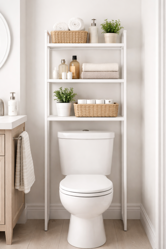 An easy, renter-friendly solution that instantly adds vertical storage. Look for a slim design that fits comfortably behind the toilet without overwhelming the room. Perfect for towels, toilet paper, and small baskets.