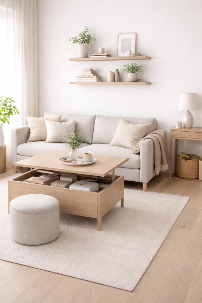 A storage ottoman is one of the most versatile pieces for a small living room. It works as seating, a footrest, and hidden storage for blankets, remotes, or everyday clutter.